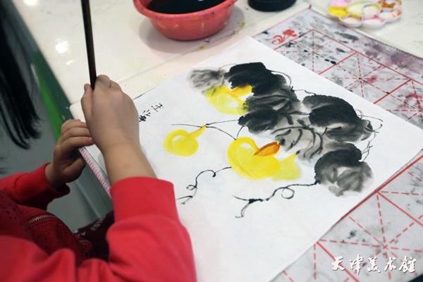 在实践环节,主讲老师先给同学们观看了葫芦的照片,引导大家考察葫芦的特点;然后在生宣纸上利用中锋和侧锋分别演示如何画葫芦和叶子。