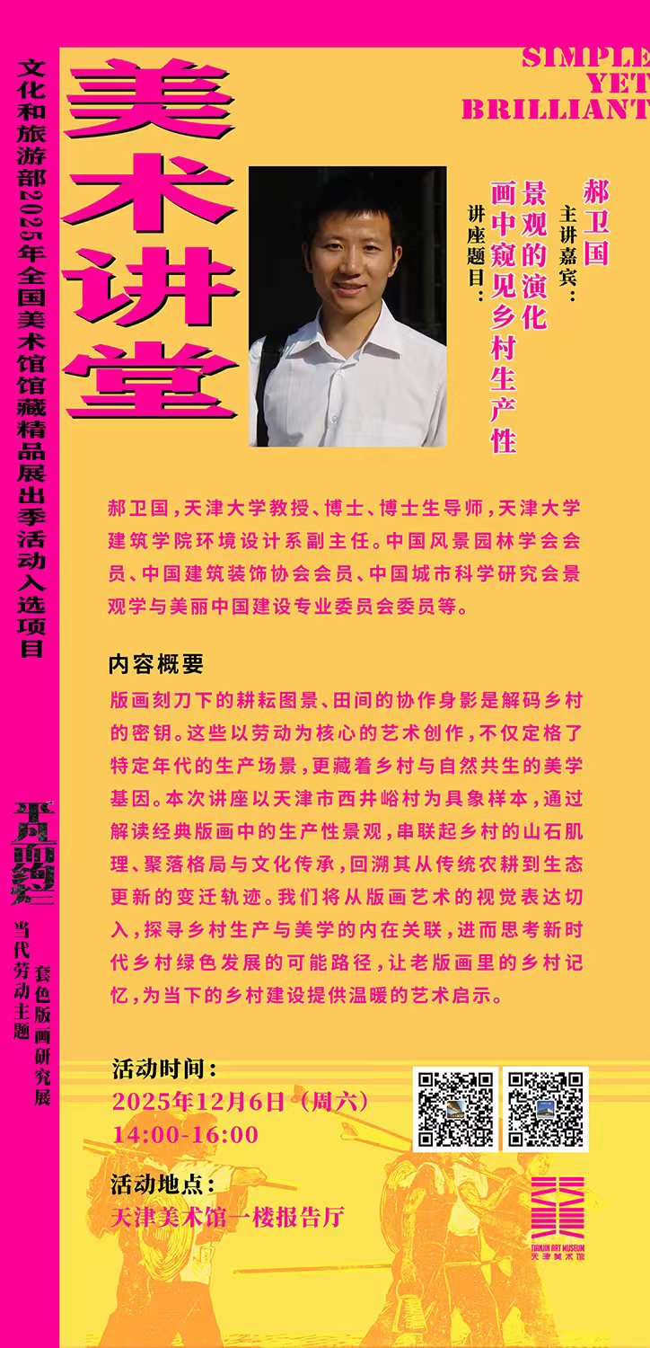 讲座题目:画中窥见乡村生产性景观的演化活动时间:2025年12月6日(周六)14:00-16:00活动地点:天津美术馆一楼报告厅主讲嘉宾郝卫国,天津大学教授、博士、博士生导师,天津大学建筑学院环
