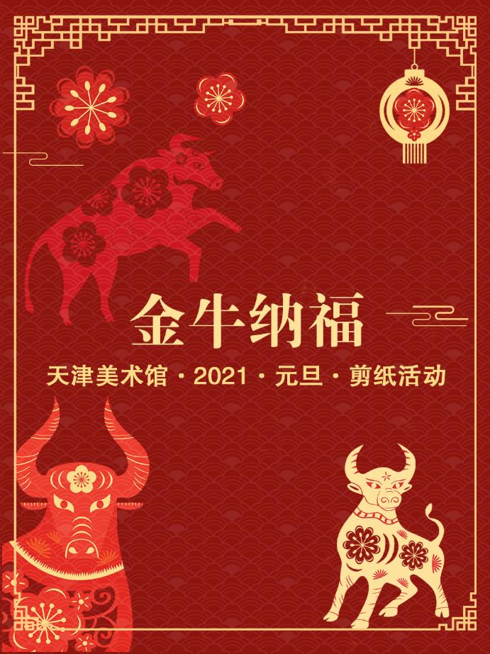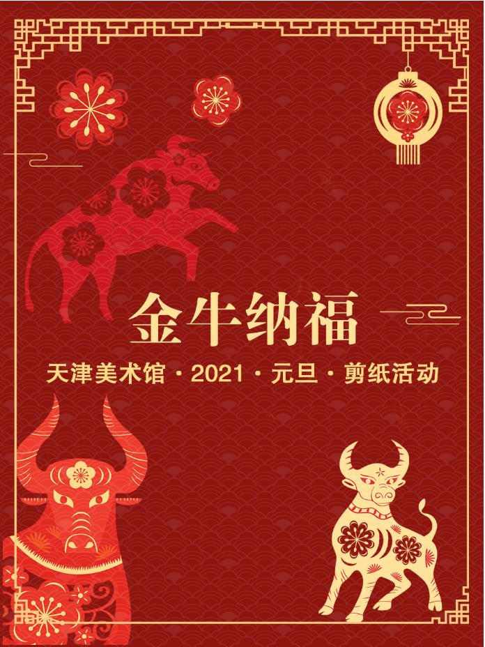 一、活动名称:金牛纳福——元旦剪纸活动二、活动时间:2021年1月1日上午9:30-11:00三、报名时间:2020年12月26日上午10:00四、活动地点:天津美术馆一楼儿童活动室五、活动对象:6周岁以上