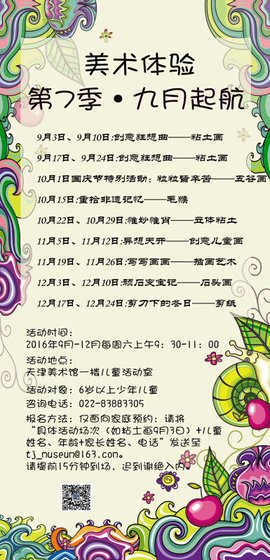 活动时间:2016年9月-12月每周六上午9:30-11:00活动地点:天津美术馆一楼儿童活动室活动对象:6岁以上少年儿童(部分活动满5岁即可参加)活动说明:天津美术馆公共教育品牌活动“美术体验”